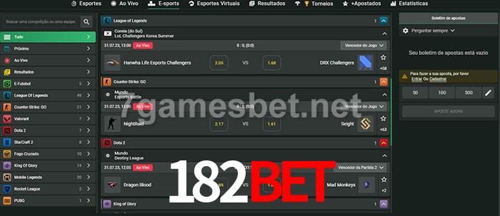 A 182Bet oferece uma seleção abrangente de opções de apostas em e-sports. Com uma ampla variedade de jogos para escolher, incluindo League of Legends, Dota 2 e CS:GO, há algo para todos os fãs de esportes eletrônicos. Além das apostas pré-jogo, a 182Bet também oferece opções de apostas ao vivo para muitos de seus eventos de e-sports. Portanto, seja você um novato em apostas em e-sports ou um profissional experiente, a 182Bet bet tem tudo o que você precisa para começar.